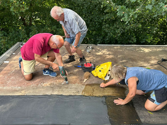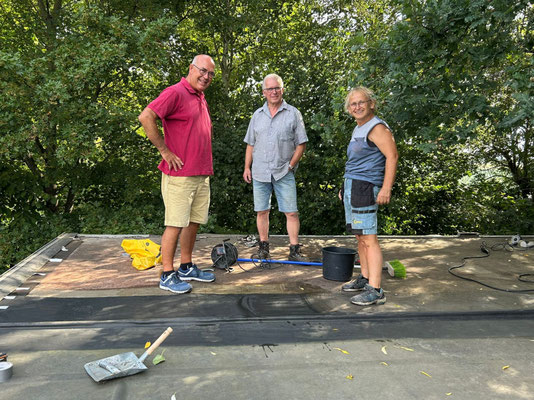 Als echte bouwvakkers waren Audrey Springer, Kees Dominicus en Frans Dingemans dinsdag 12 augustus (2025) keurig om 8.00 uur bij De Ark aanwezig om het dak van de oude opslagcontainer van nieuw ‘dakleer’ te voorzien. De regen liep namelijk al enige tijd naar binnen en dat er nog geen kortsluiting ontstaan was, mocht een wonder heten.
